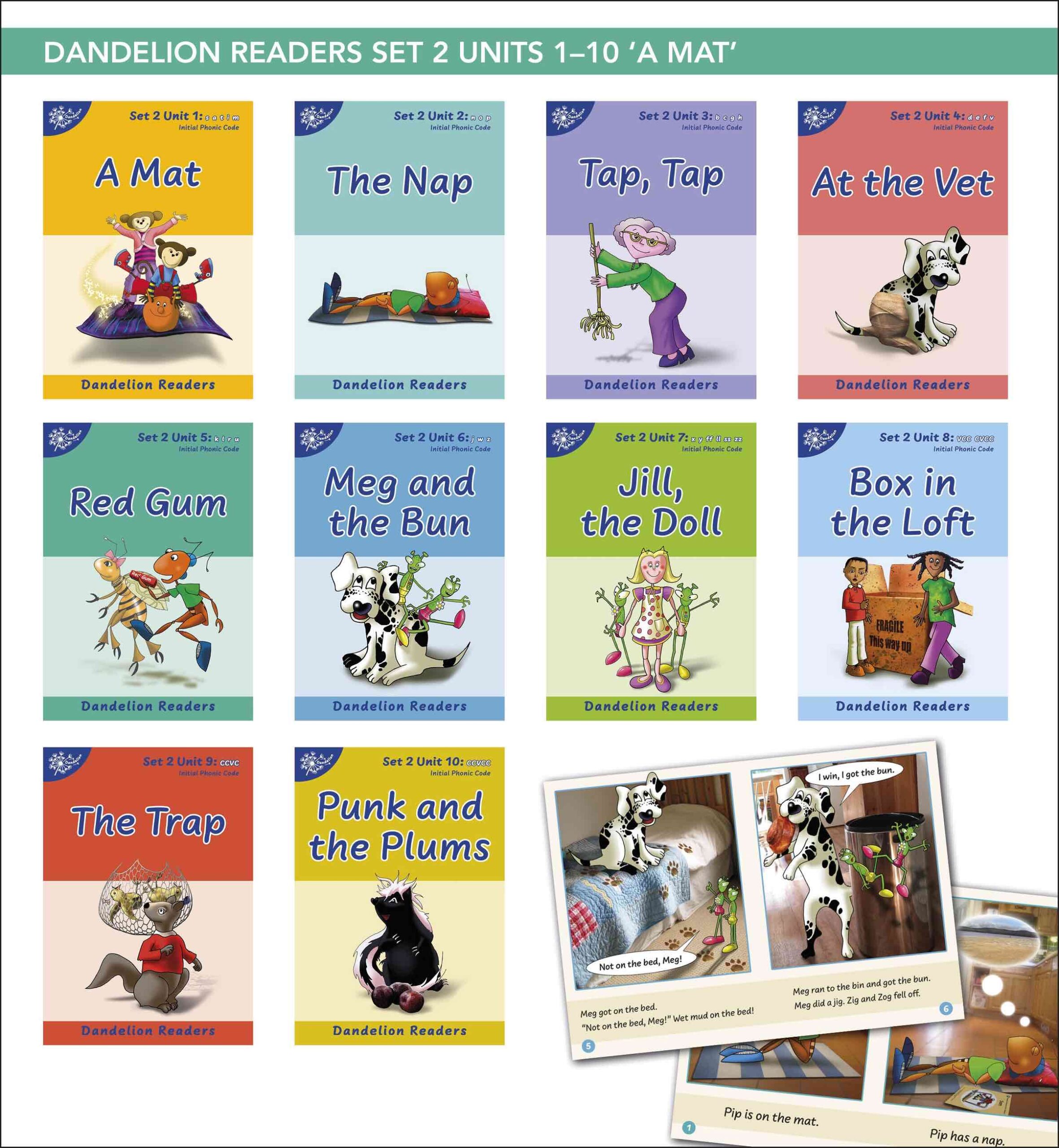 Phonic Books Dandelion Readers Set 2 Units 1-10 A Mat (alphabet code blending 4 and 5 sound words) comprises ten books and is aimed at children in Reception to Year 2.