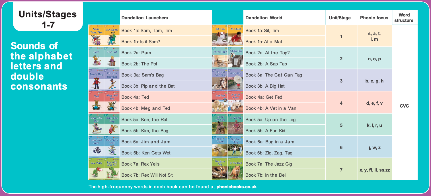 Phonic Books Dandelion World Stages 1-7 comprises 14 non fiction books. Aimed at children in Early Years (pre school and Reception), each stage introduces a few sounds at a time, allowing independent reading from the outset. Each stage practises new letters/sounds while supporting previously taught letters/sounds and high frequency, or sight words. There are two books at each stage to reinforce learning: