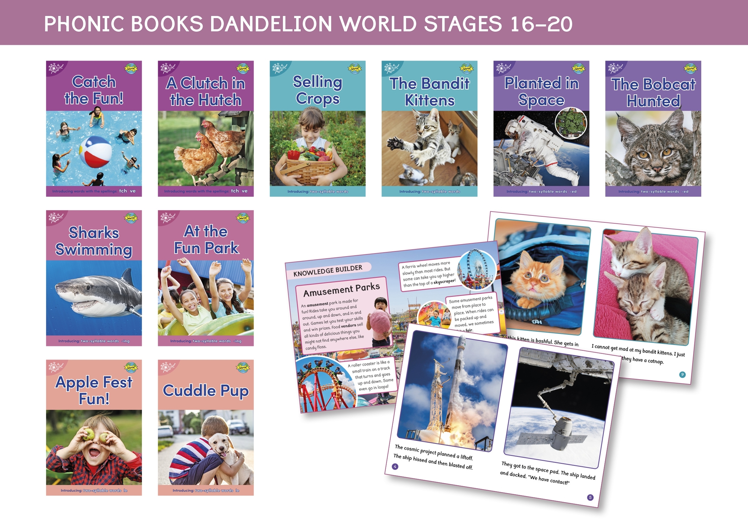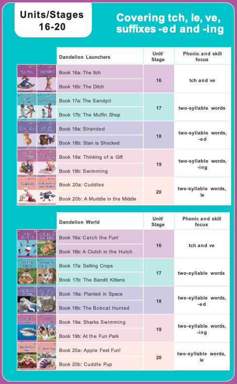 Phonic Books Dandelion World Stages 16-20 comprises 10 non-fiction books. Aimed at Pre K to Kindergarten children, each stage introduces spellings, suffixes, and simple two syllable words. Each stage practises new letters/sounds while supporting previously taught letters/sounds and high frequency words, or sight words. There are two books at each stage to reinforce learning: