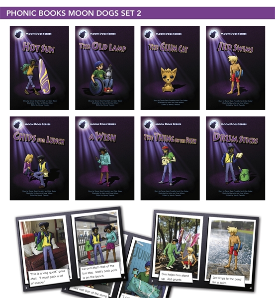 Phonic Books Moon Dogs Set 2 comprises eight books designed for older children at the very early stages of reading.