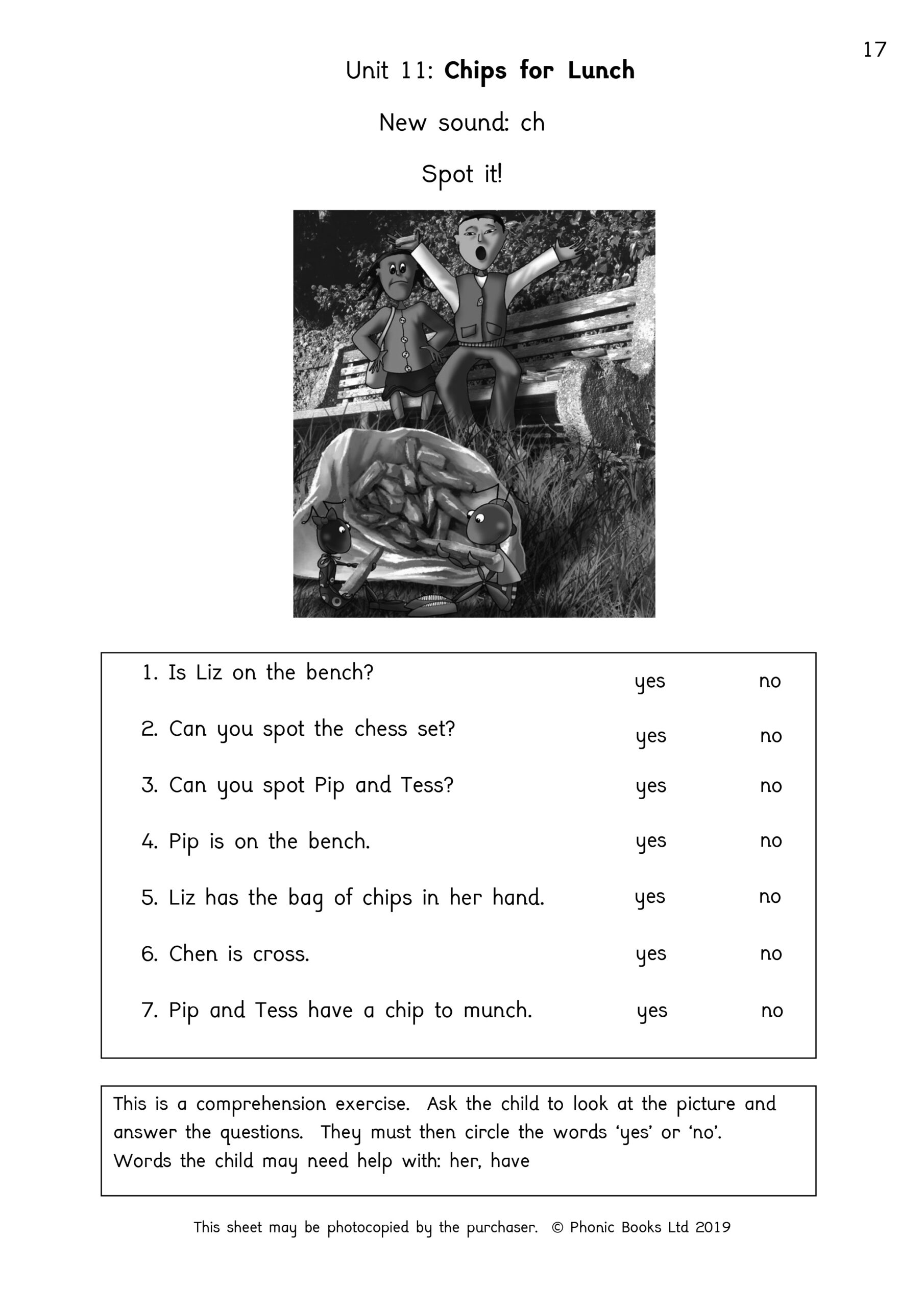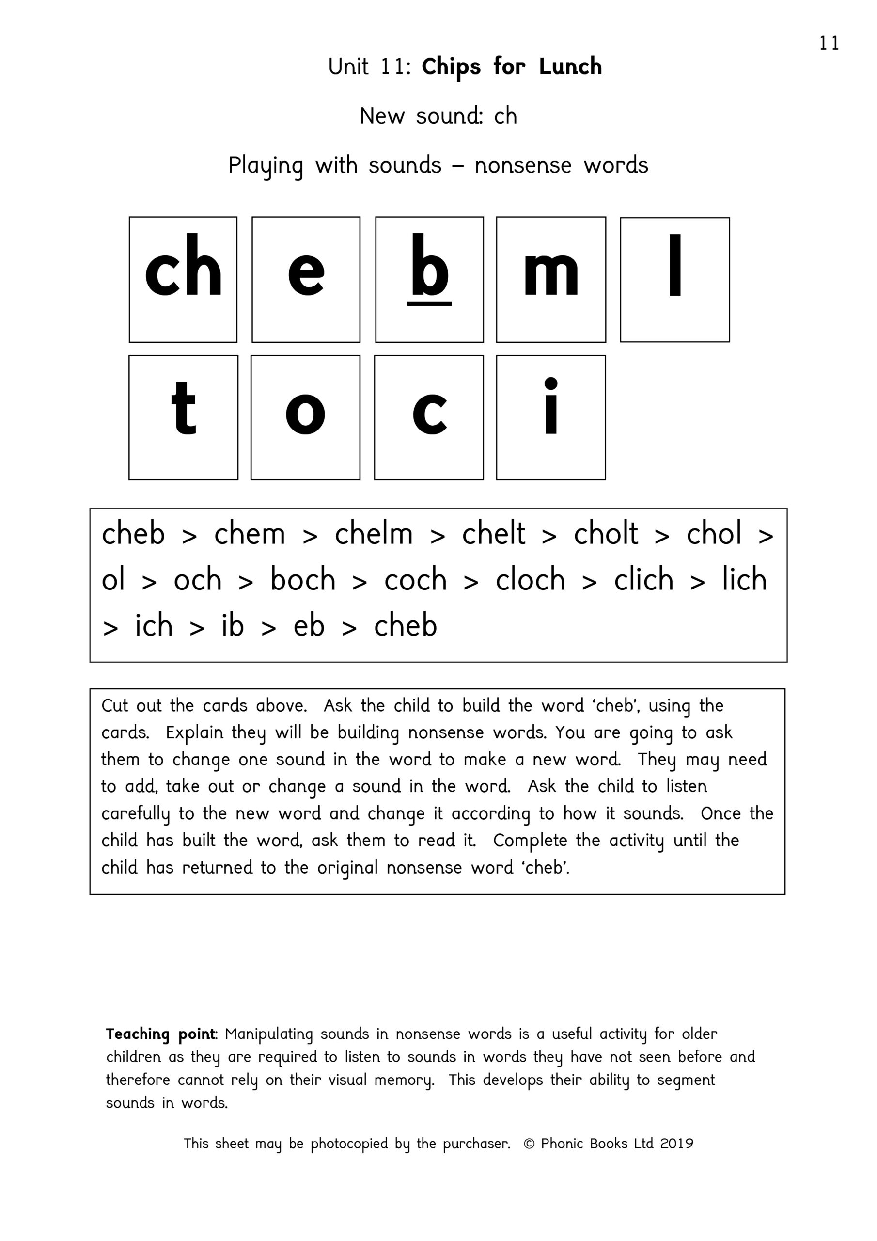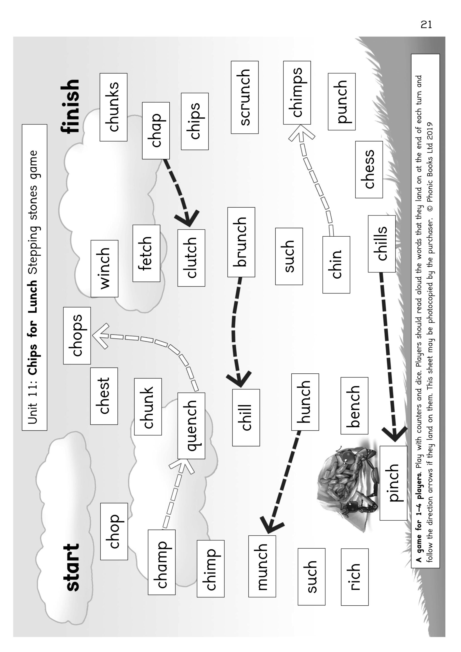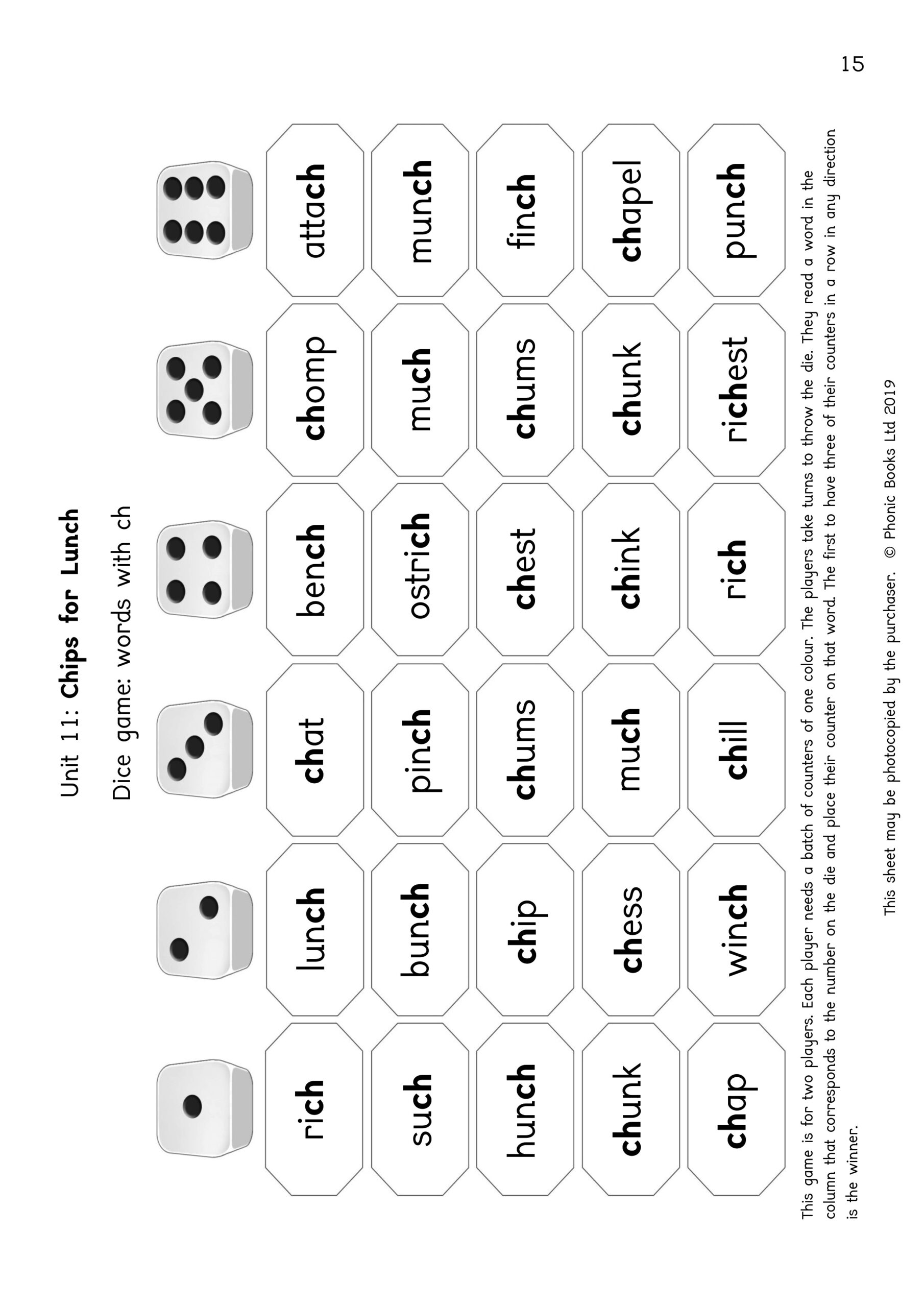 Accompanying photocopiable activities covering word building, writing, blending and games for Phonic Books Dandelion Readers Set 2 Units 11-20 Chips for Lunch (two letter spellings sh, ch, th, ng, qu, wh, -ed, -ing, -le).